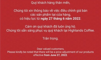Thông báo của Highlands Coffee cho biết, việc điều chỉnh giá nhằm giữ vững và thậm chí nâng cao hơn chất lượng sản phẩm, dịch vụ và trải nghiệm của quý khách hàng trước tình hình biến động thị trường. Qua đó, Highlands Coffee hy vọng sẽ nhận được sự thông cảm từ quý khách hàng, và mong quý khách sẽ tiếp tục tin tưởng, ủng hộ thương hiệu.